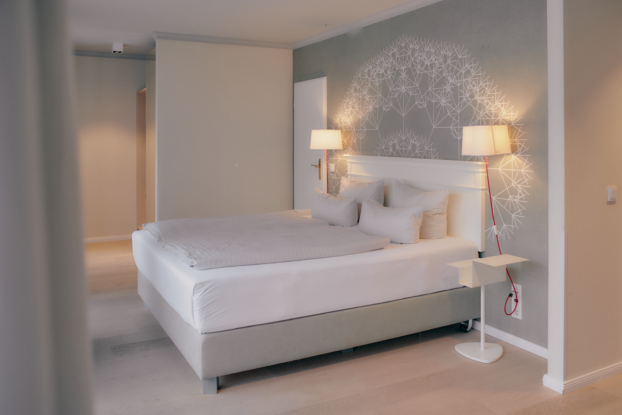 Hier fügt sich alles mit leiser Selbstverständlichkeit zu einem Ganzen. Edles Eichenholzparkett trägt die Eleganz des Raumes, ein großzügiger Wohnbereich schenkt Weite, während das luxuriöse King-Size-Boxspringbett die wohlverdiente Erholung verspricht. Kleine Details setzen Akzente, machen den Unterschied und verleihen Persönlichkeit.